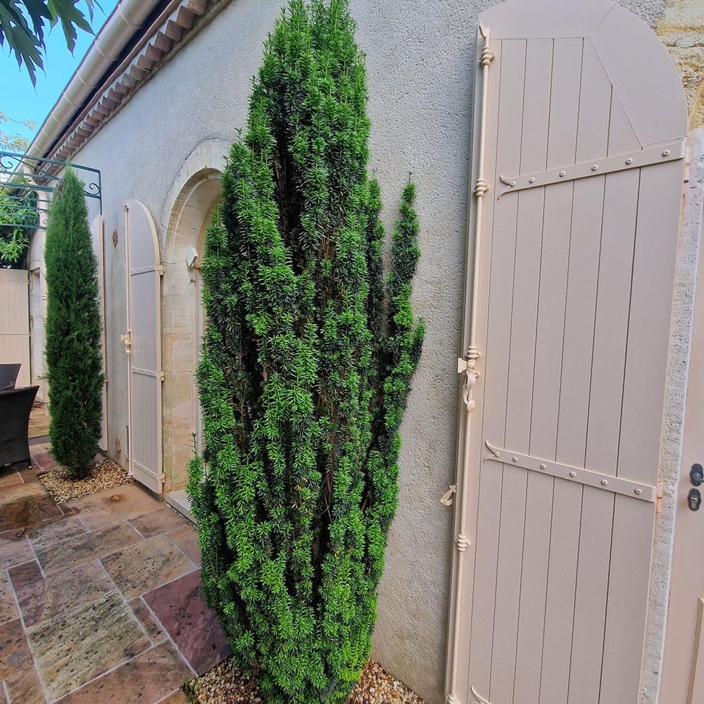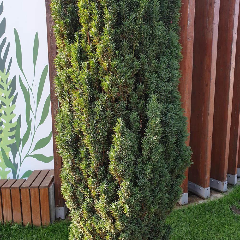 Taxus baccata Fastigiata isi pastreaza obiceiul tipic de crestere chiar si la batranete. De indata ce a prins bine radacina, atinge o crestere anuala de 25-50 cm. In conditii adecvate si cu o ingrijire buna, planta poate atinge o inaltime de 3-8 metri. Frunzele acelor sunt de culoare verde, iar partea inferioara este gri deschis. Acele lungi de 1 - 3 cm stau singure in cerc pe lastari.