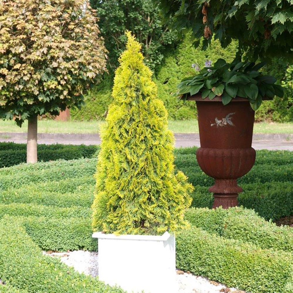 Numele arborelui Golden Emerald (Thuja occidentalis Golden Smaragd) vorbeste de la sine: este o bijuterie printre Thuja. Foarte versatil, galben-verde pestrit Golden Smarald poate fi folosit pentru a crea efecte de lumina frumoase si pentru a oferi un fundal contrastant pentru straturile de flori. In grup sau individual, intr-un ghiveci sau ca planta de gard viu - coloratul Golden Smaragd atrage atentia.
